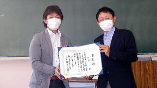 鈴木さんは在職時、奥三河の出来事を熱心に中日新聞東三河版に記載されていましたが、特に田口高校については、入学式や文化祭などの学校行事、林業科の取組などを、小規模校への愛情あふれる記事で紹介し続けてくださいました。今回のご退職にあたり感謝状を贈呈しました。鈴木さんは、林業科のレーザー刻印を施した特製感謝状に大変喜んでくださり、田口高校への熱いエールをくださいました。