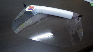 *フェイスシールド:顔面に付けた透明なアクリル板により飛沫の飛散を防止します。