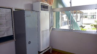 学校休業に伴う長期休業期間の変更のため、今年は8月に授業が行われます。熱中症防止や学習環境整備のため、仮設クーラーを設置しました。普通教室6教室と清和寮に設置し、今夏に限って運転します。
