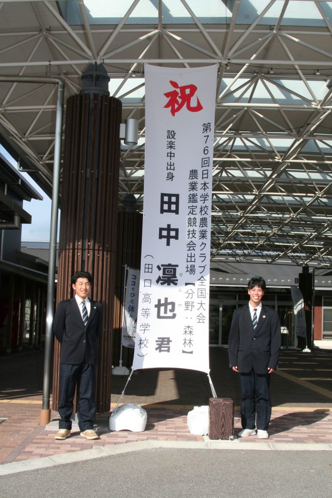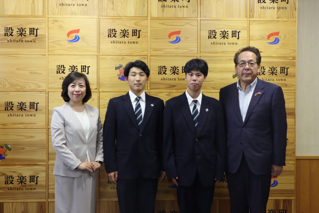 1年生/2年生/3年生/学校生活 設楽町長への表敬訪問 2025年10月3日 10月2日(木)、林業科2年田中凜也さん、林業科3年福山朝陽さんが、土屋町長に表敬訪問をしました。7月29日に県立半田農業高等学校で実施された農業鑑定競技会(分野森林)において最優秀と優秀賞を受賞した報告と10月22日に山梨県で開催される「第76回全国学校農業クラブ全国大会」出場に向けての抱負を伝えました。 全国の高校生が日頃の学習成果を発揮し、農業に関する知識や技術を競い合う大会です。田口高校林業科は、今年度を含め6年連続で全国大会への出場となります。ふたりの健闘を期待しています。