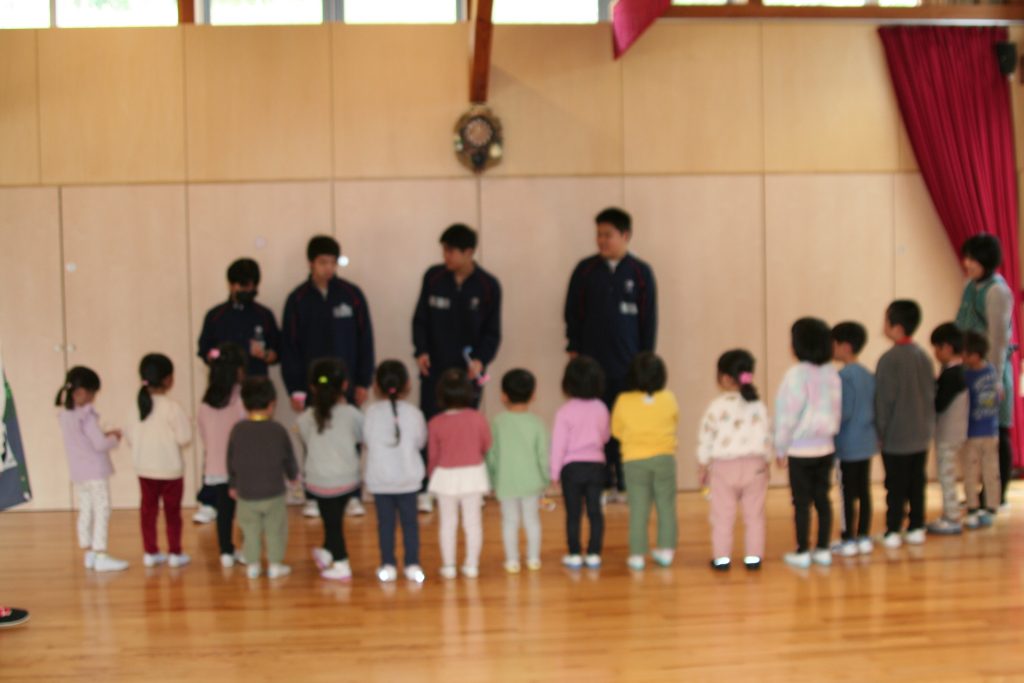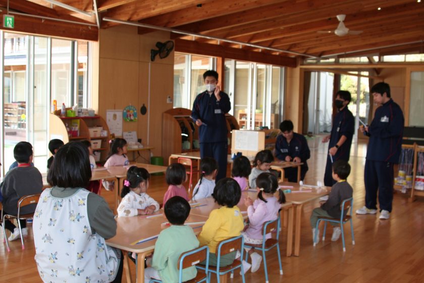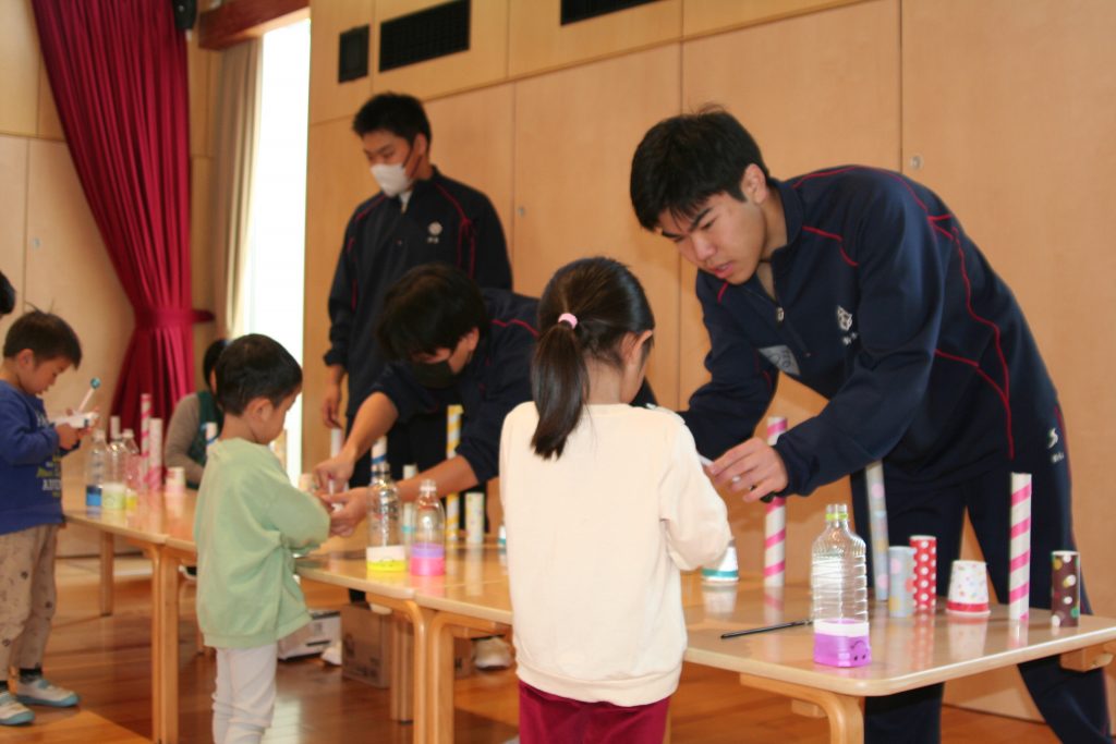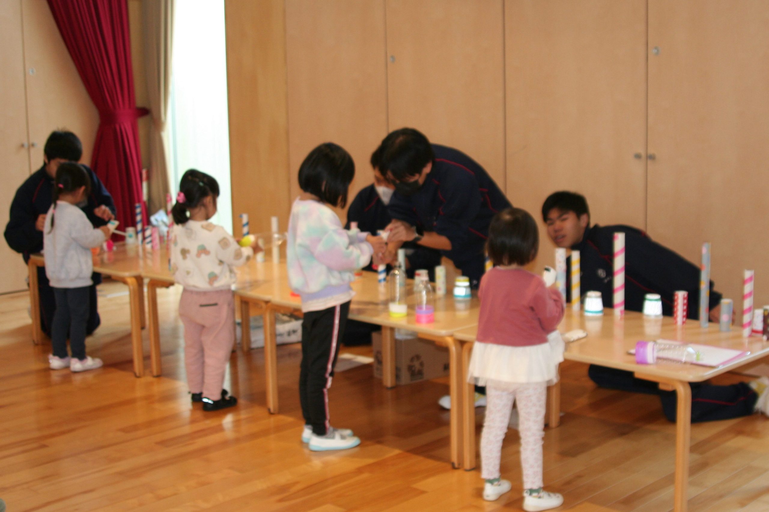 11月4日(火)2.3時間目を利用し、田口清嶺保育園に訪問に行きました。9月に予定していたレクリエーション小物を持参し、園児と一緒に楽しみました。