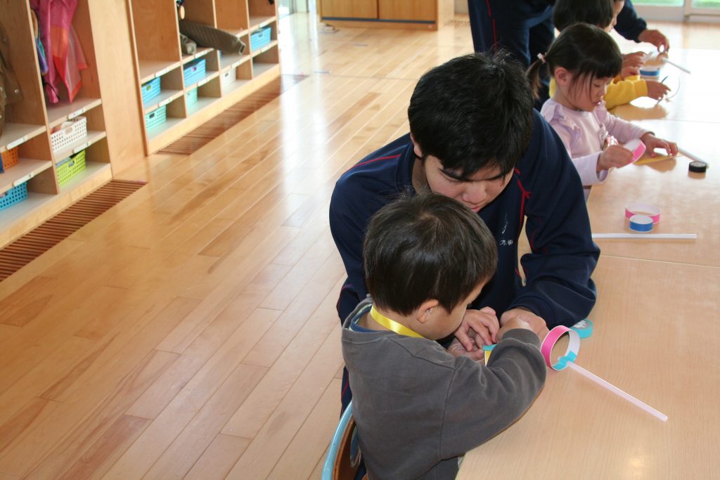 次にストローを利用した飛行機を園児と一緒に作成しました。細い帯の厚紙にストローをテープで止めるのがなかなか難しく、苦戦しましたが、何とか園児全員が思い思いのストロー飛行機を作成し、最後は皆で飛ばすことができました。 無事に保育園訪問ができて、よかったです。
