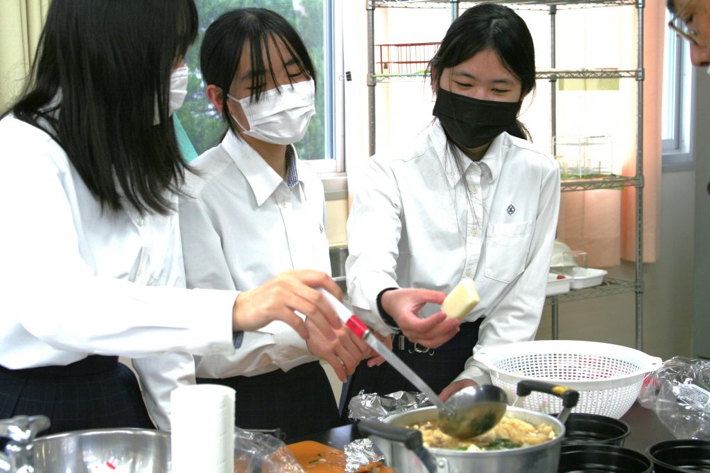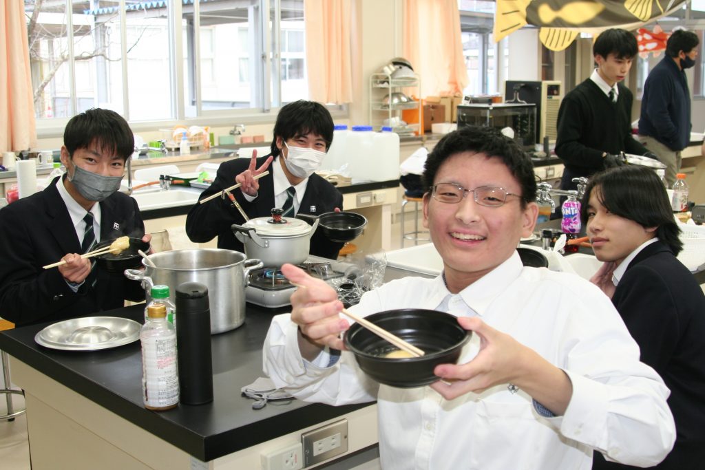 2年生/学校生活 2年総合 ふるさと学習 2026年1月19日 1月15日(木)に、2年生が総合の時間にふるさと学習の一環で、日本のお正月料理の一つであるお雑煮を作りました。事前に地元や全国(郷土)のお雑煮について調べ、作ってみたいお雑煮を各グループで話し合い、当日は材料を持ち寄って調理しました。 完成したお雑煮は見た目も味もそれぞれで、各グループの特色が出ており、食べ比べも楽しむことができました。校長先生をはじめ、多くの先生方も参加し、交流を深めていました。